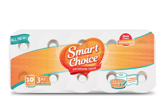 SmartChoice is always the best choice. Bringing you the first of its kind Giant Roll Tissue with over 1000 thicker sheets made from Virgin Pulp using new innovative Pure-soft technology. With SmartChoice, you'll never run out of tissue again.